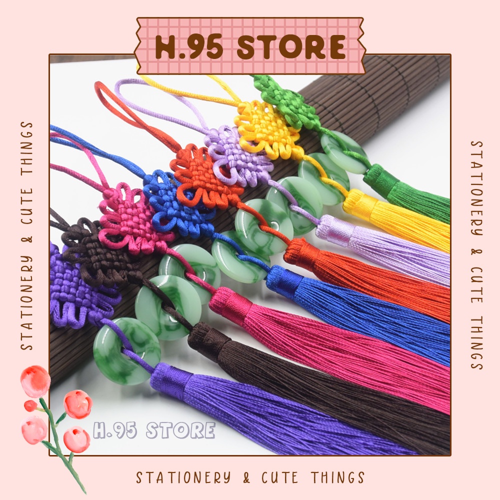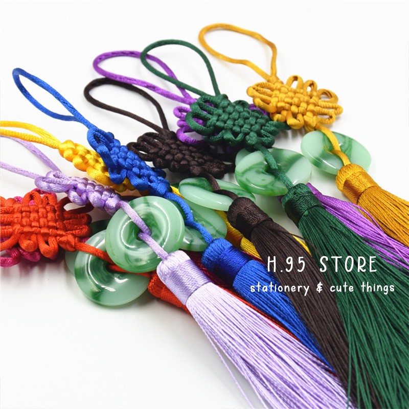 - Chất liệu: Resin giả ngọc, nút kết và tua rua làm bằng chỉ polyester