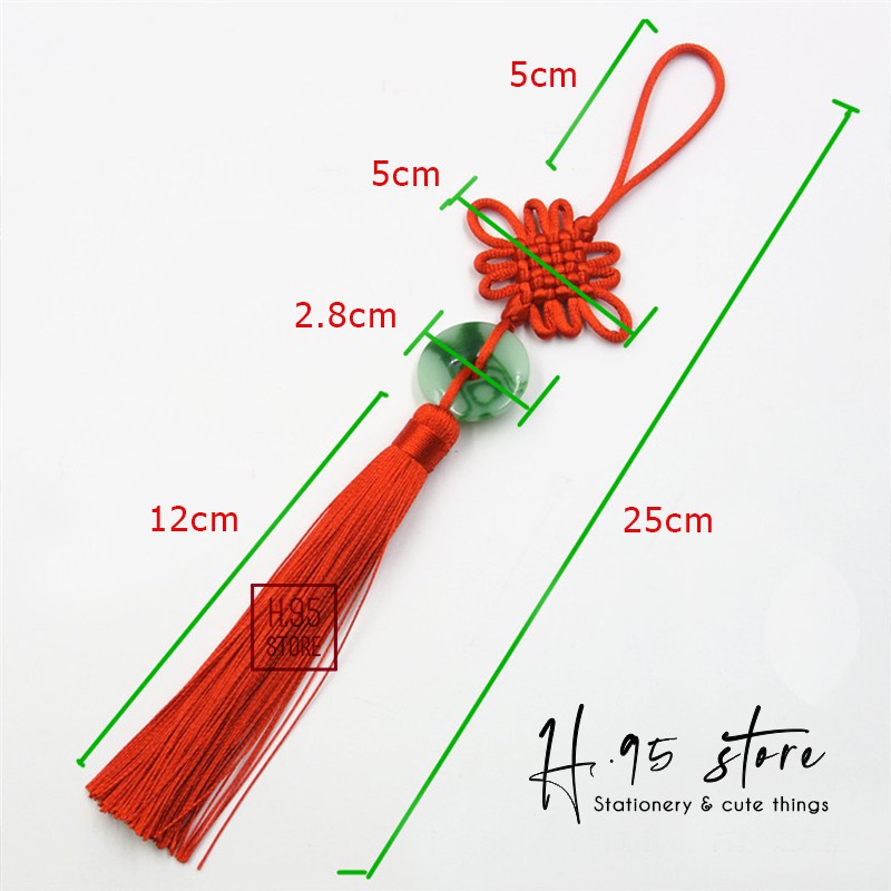 Đồng tâm kết gắn ngọc bình an xanh phỉ thúy, phụ kiện sáo, đàn, trang trí áo dài, áo tấc- Kích thước: Tổng chiều dài 25 cm, nút kết đường kính 5 cm, ngọc đường kính 2.8 cm