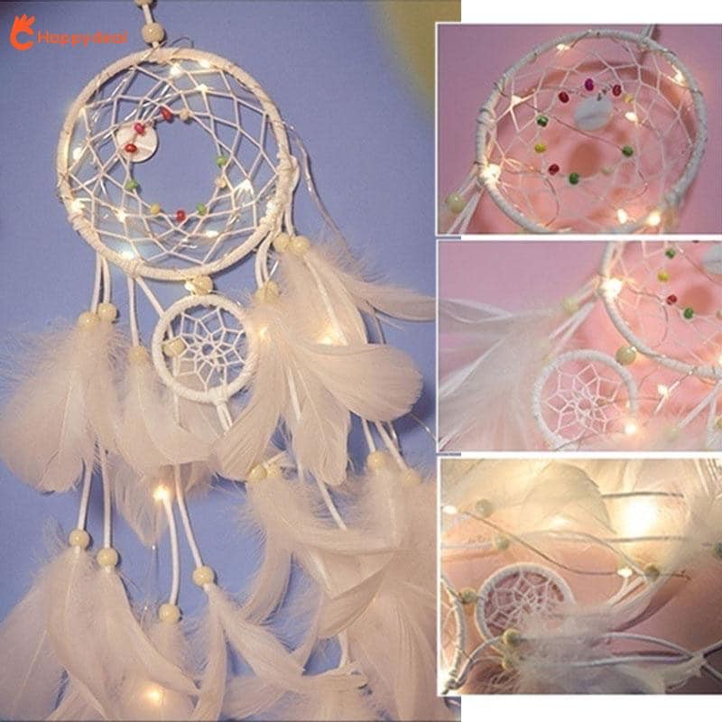 Nhà cửa & Đời sống > Trang trí nhà cửa > Khác || Dreamcatcher gắn lông vũ tự nhiên treo trang trí đẹp mắt màu trắng tinh khiết- kèm đèn led sáng lung linhCòn hàng