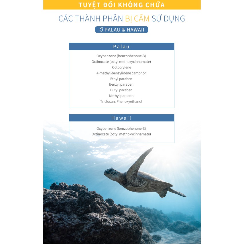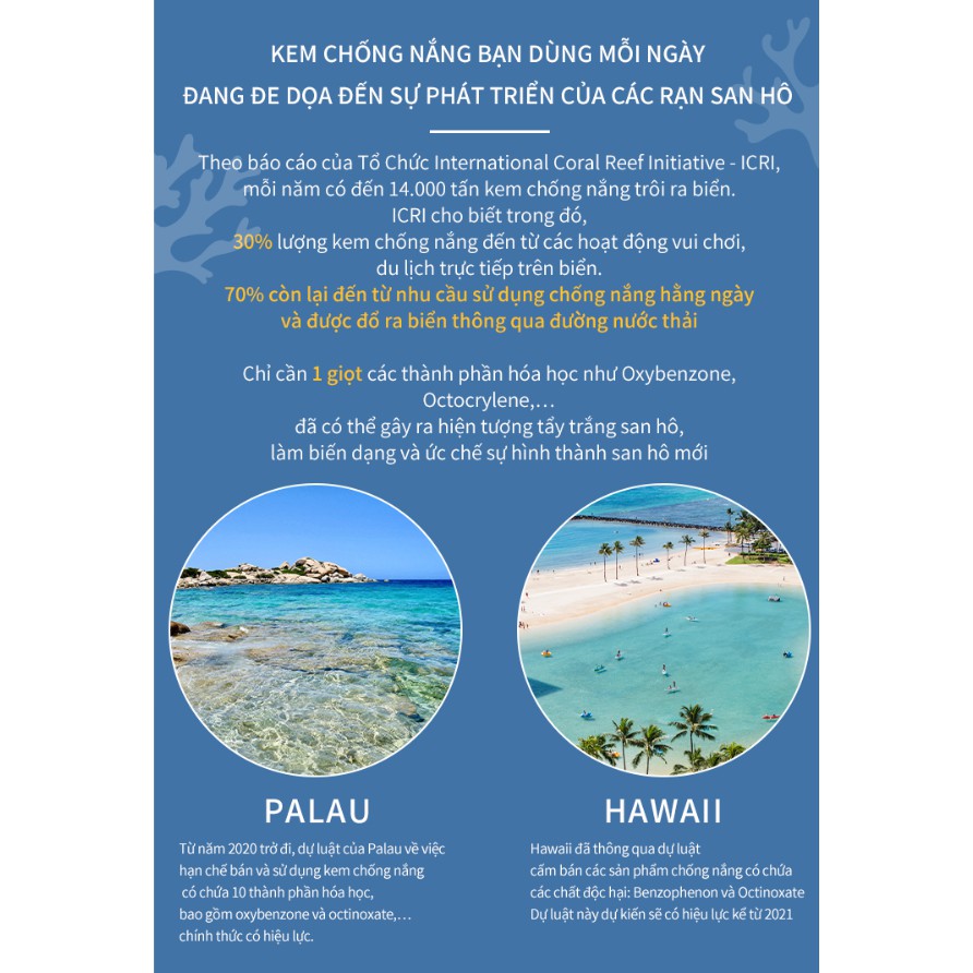 Chỉ cần 1 giọt các thành phần hóa học như Oxybenzone, Octocrylene, ... đã có thể gây ra hiện tượng tẩy trắng san hô,làm biến dạng và ức chế sự hình thành san hô mới