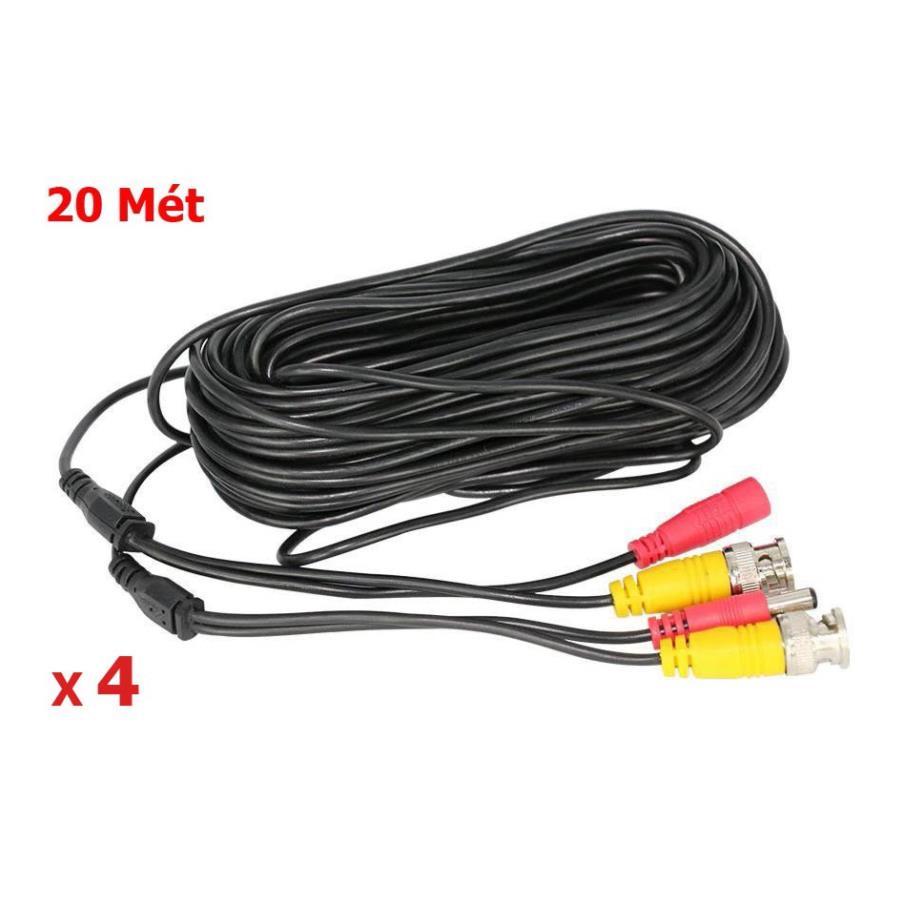 - 4 cuộn dây, mỗi cuộn 20 Mét ( dây tín hiệu liền nguồn đúc sẵn 2 đầu 4 bộ vít nở gắn camera )