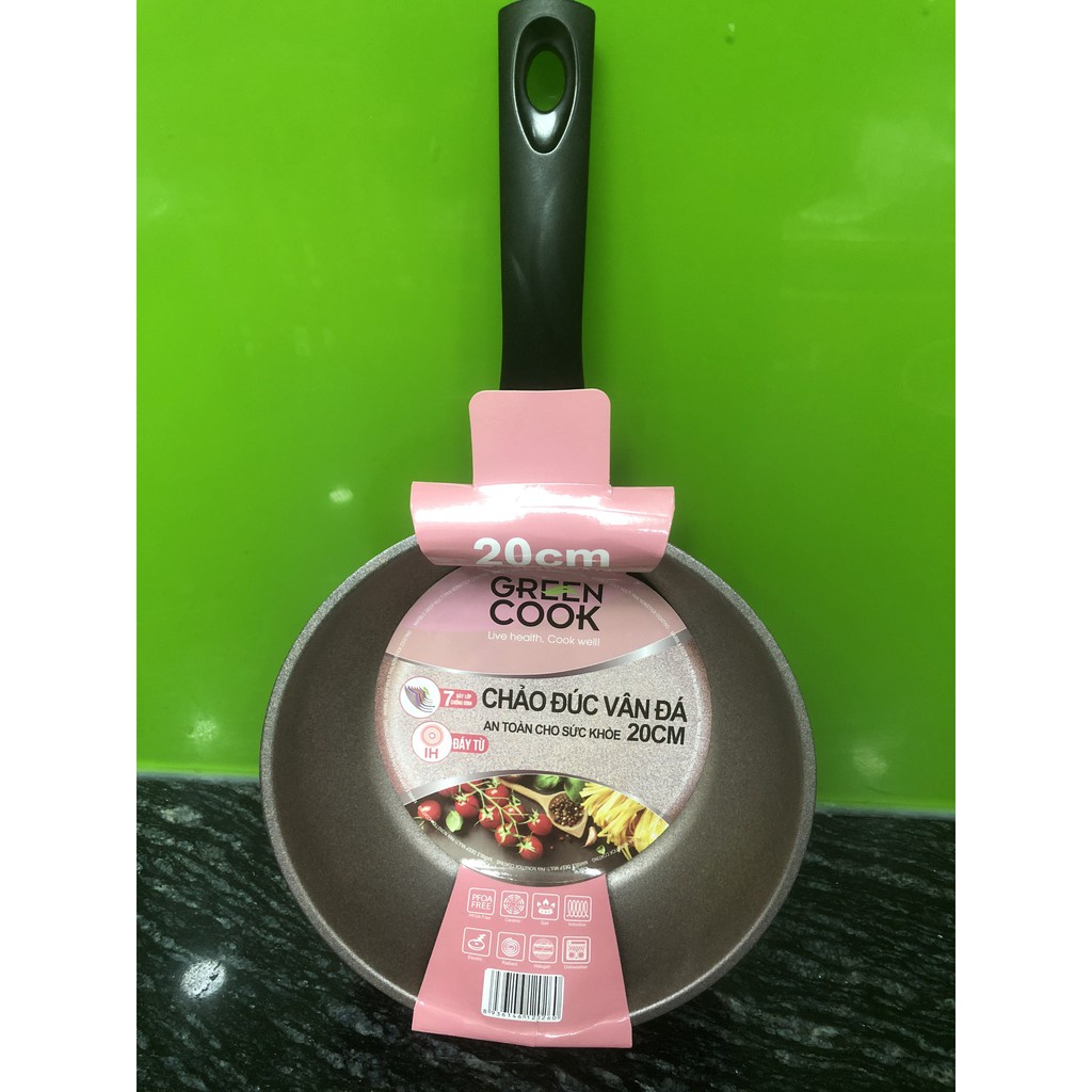NOTE: RIÊNG SIZE 18 KO DÙNG ĐƯỢC BẾP TỪChảo đúc vân đá đáy từ sâu lòng 20 cm Green Cook GCP05-20IH được sản xuất theo công nghệ cao Hàn Quốc, phủ đá thiên nhiên siêu bền và thân thiện với môi trường. Phủ 7 lớp chống dính vân đá siêu bền, an toàn cho sức khỏe, dày 3mm, chịu lực tốt, chống biến dạng chống dính tốt, dễ lau chùi. bắt nhiệt nhanh hạn chế thời gian nấu nướng.
