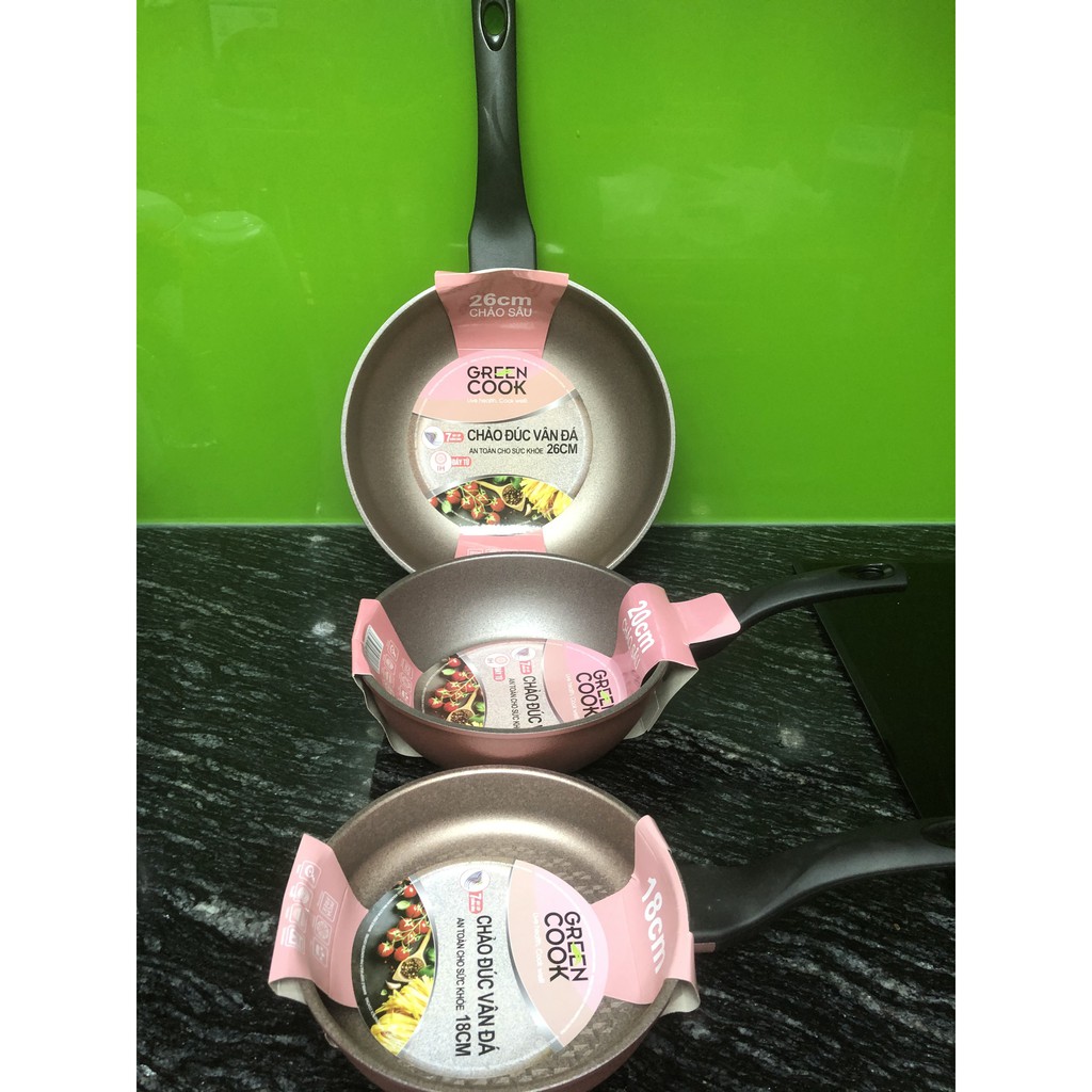 Giới thiệu [ĐỦ SIZE] CHẢO ĐÚC VÂN ĐÁ ĐÁY TỪ chống dính 7 lớp GREEN COOK (màu hồng siêu xinh)