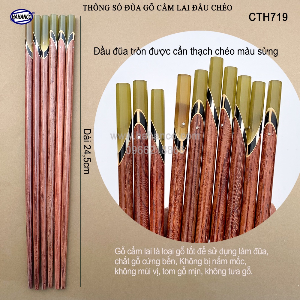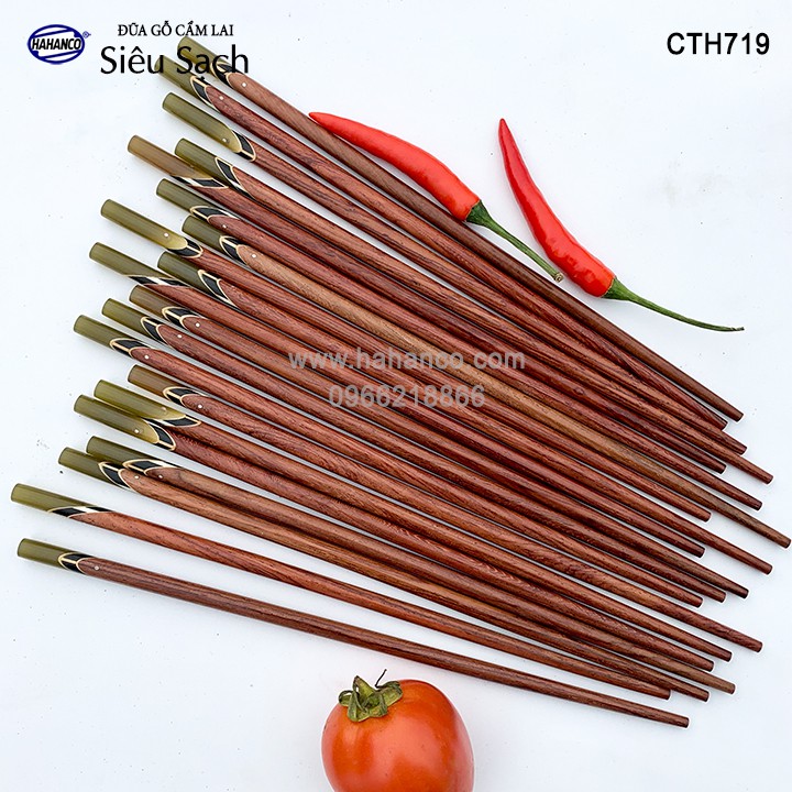 Giới thiệu Đũa Gỗ Cẩm Lai Đầu Cẩn Thạch Chéo Một Màu HAHANCO (10 Đôi) Vân Gỗ Đẹp - CTH719