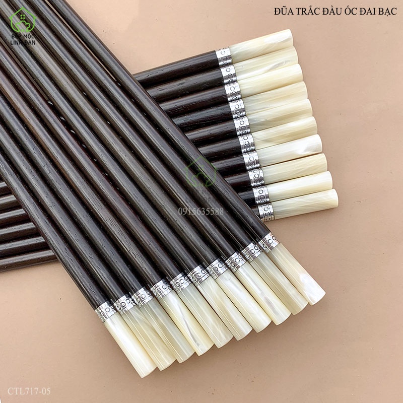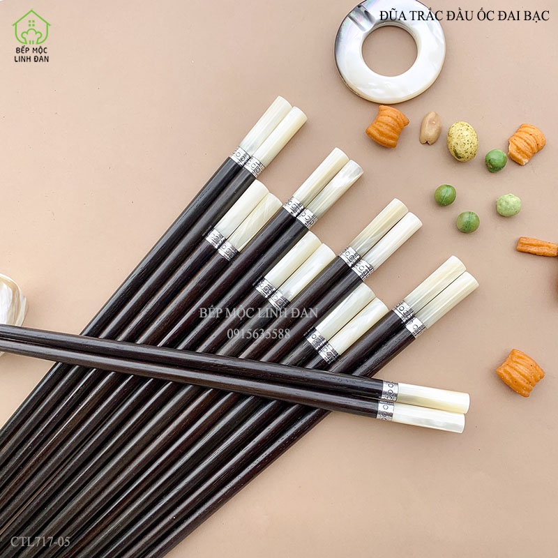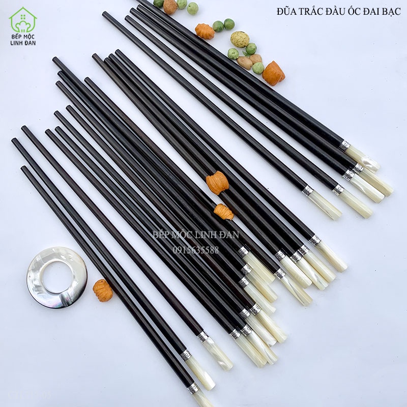 Đũa gỗ trắc đầu ốc biển NewZealand viền đai bạc - Đẳng cấp siêu sangĐây là mẫu đũa cao cấp, chóp đũa làm từ ốc biển nhập khẩu từ New Zealand và Úc, vùng biển sạch nhất thế giới, những loại ốc quý hiếm và bào ngư mới sống được, gắn với thân đũa bằng đai bạc, tạo nên nét sang trọng bậc nhất trên bàn ăn gia đình, trên bàn tiệc hay trong nhà hàng cao cấp. Thân đũa được làm từ gỗ trắc tự nhiên 100% để mộc, được chọn lọc gỗ loại 1, toàn bộ thớ dọc nên thân đũa cứng, ít cong vênh, chống gãy, không bị mốc, dùng lâu không bị mủn đầu, xước dăm.