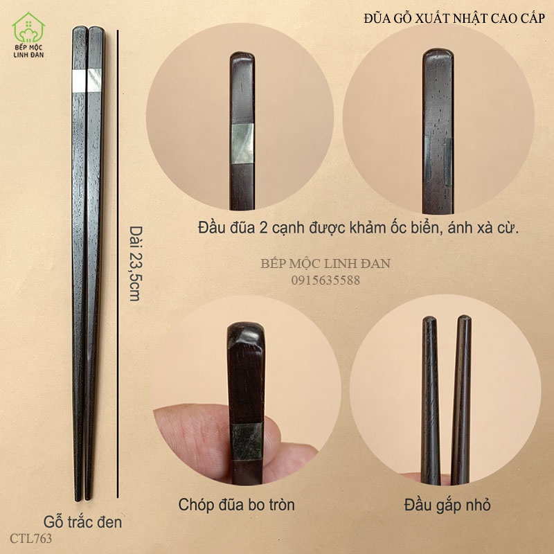 Thân đũa được làm từ gỗ trắc tự nhiên 100% để mộc, được chọn lọc gỗ loại 1, chóp đũa khảm xà cừ 2 cạnh, với đặc điểm khác biệt: thân đũa ngắn và nhẹ, đầu đũa thon nhỏ, tạo nên nét đẹp rất tinh tế và sang trọng.