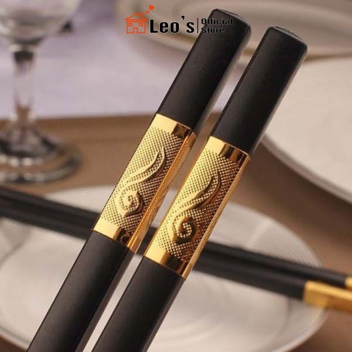 Đũa mạ vàng cao cấp phong cách Hàn Quốc, Nhật Bản, đũa nhựa đen hợp kim mạ vàng chống trơn Leo's-Officail