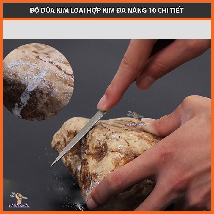 Bộ dũa mài bao gồm 10 loại với các đầu dũa dạng: tròn, bán nguyệt, tam giác, vuông, hình lưỡi dao... hỗ trợ mọi chi tiết, chất liệu bạn mong muốn.