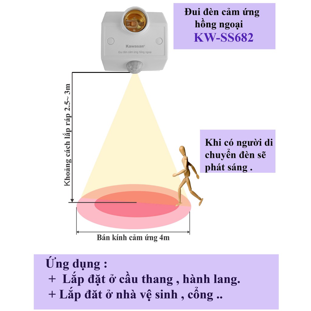 Gắn thiết bị lên tường, trần nhà sau đó gắn bóng đèn xoáy chuẩn E27 vào cắm nguồn điện, lúc đầu đèn chớp 3 lần rồi tự tắt, khi trời tối, nếu có người di chuyển trong vùng quét của cảm ứng, lập tức đèn sẽ bật sáng và được duy trì liên tục.