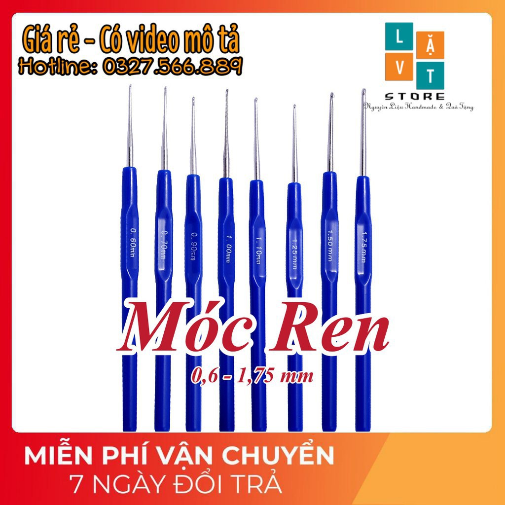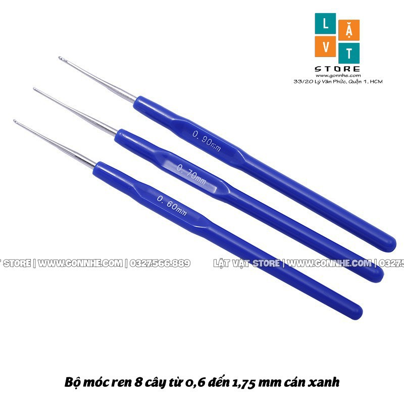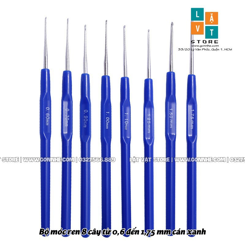 Chào các bạn, mình là Lặt Vặt đây. Cảm ơn bạn đã quan tâm đến sản phẩm của mình.Sản phẩm ngày hôm nay Bộ dung cụ 8 cây Móc Ren, Móc len cán màu xanh từ 0,6 đến 1,75 mm.