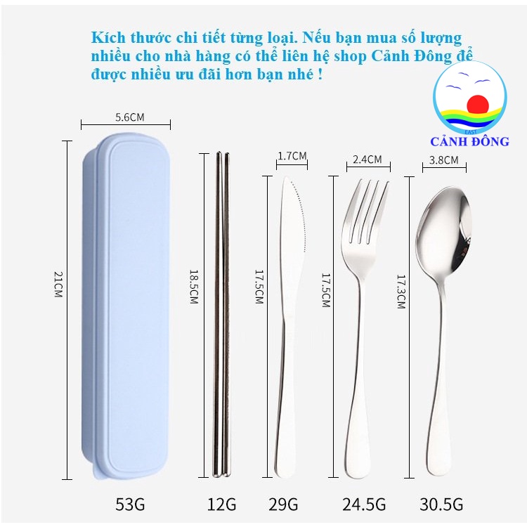 Kích thước: Hộp Dài 21cm Rộng 5.6cm, Đũa Dài 18.5cm, Giao Dài 17.5cm Rộng 1.7cm, Nĩa Dài 17.5cm Rộng 2.4cm, Muỗng Dài 17.3cm Rộng 3.8cm