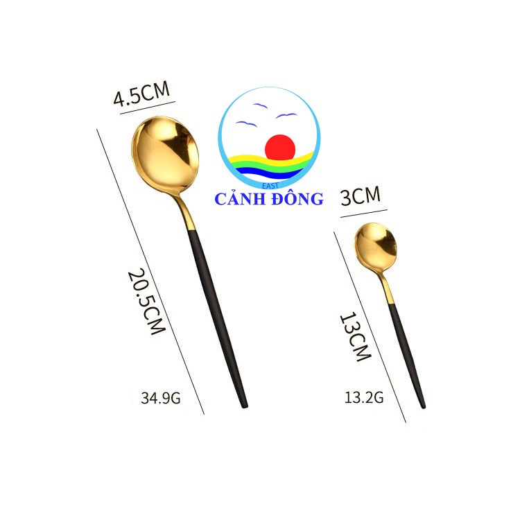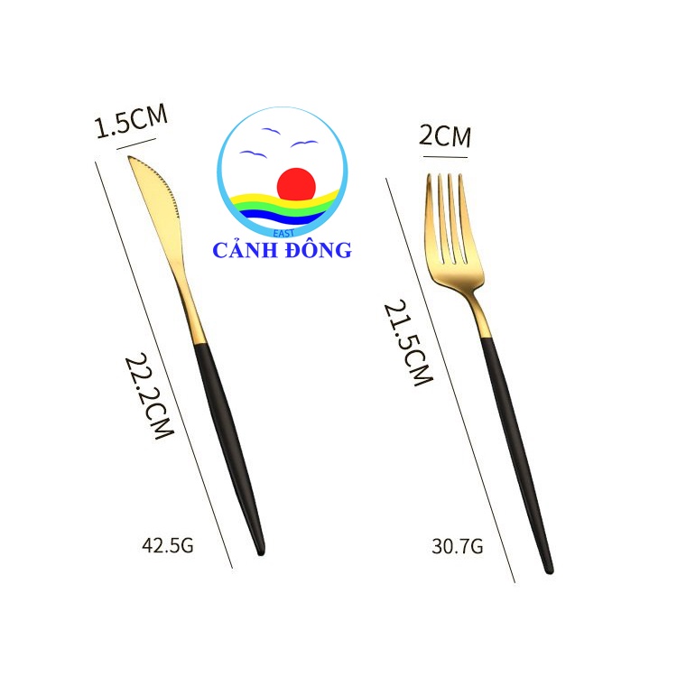 Kích thước: Giao Dài 22.2cm Rộng 1.5cm, Nĩa Dài 21.5cm Rộng 2cm, Muỗng Dài 20.5cm Rộng 4.5cm, Thìa nhỏ Dài 13cm Rộng 3cm.