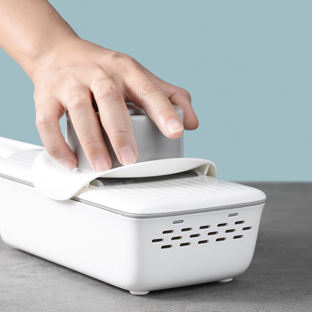 Ngoài ra, phần mũi phía trên của hộp đựng thực phẩm còn có các lỗ thoát nước, nhằm tạo điều kiện thuận lợi để người dùng rửa rau củ trực tiếp bằng nước mà không cần phải tốn thêm bất kỳ thau rửa rau nào. Đặc biệt, thiết kế ngăn chứa lưỡi dao khoa học ở mặt sau bộ phận bào cắt giúp bạn thuận tiện tháo lắp và lấy lưỡi dao dễ dàng, tránh trường hợp thất lạc.