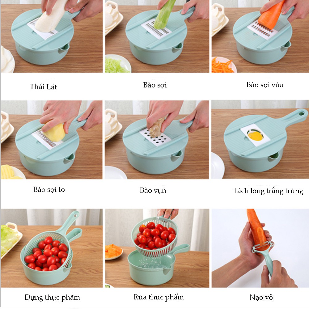 Khi bào, các lát, sợi được cắt mỏng, đều đặn, đẹp mắt. Ko bị vương vãi khi sử dụng. Các mẹ có thể dùng để cắt lát khoai tây, cắt lát bí ngòi, chuối xanh, bí đao, su su, đu đủ, cà rố Bào sợi để làm nộm. Mài củ gừng để làm trà gừng.