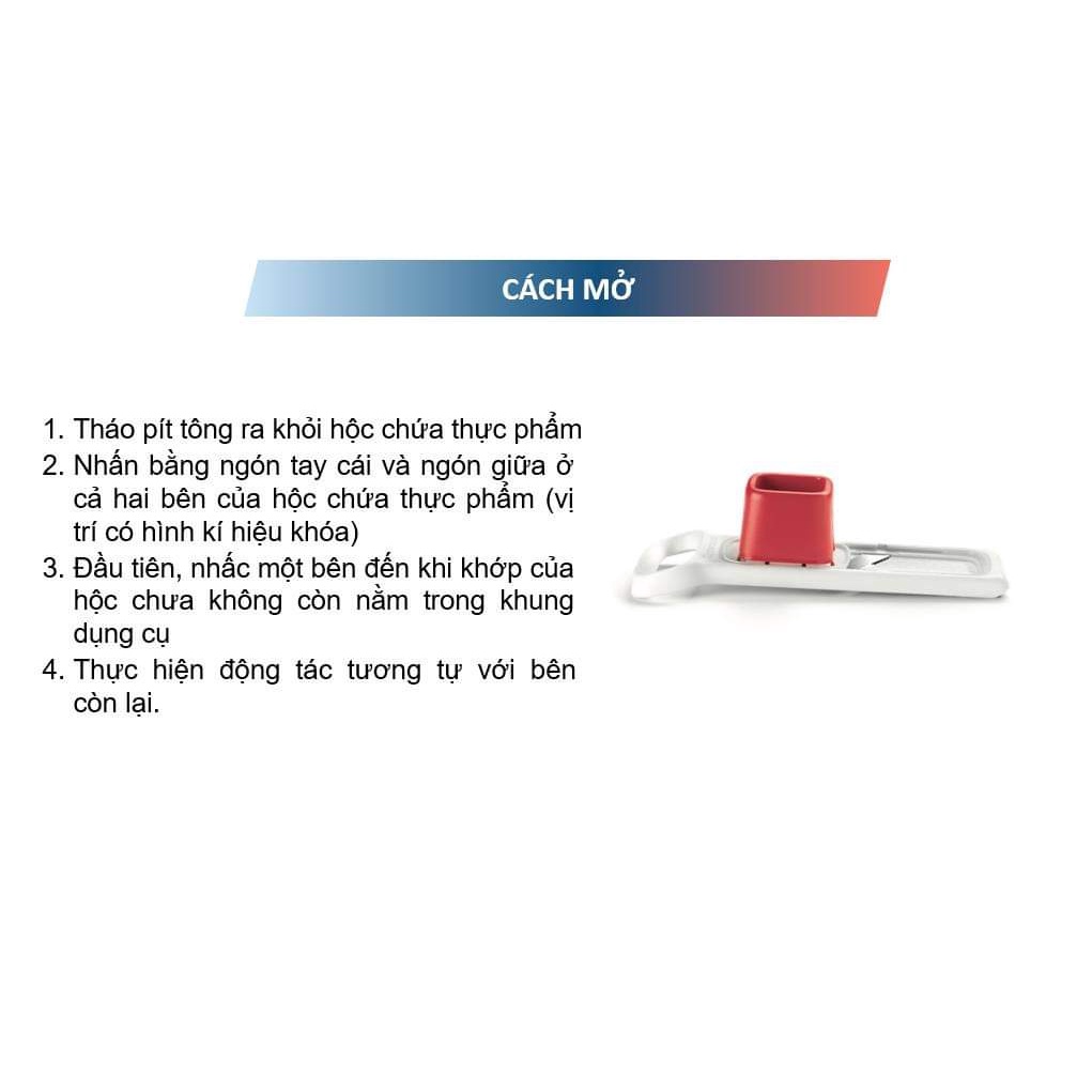 - Hộc chứa thực phẩm và pít tông giữ các nguyên liệu có kích thước nhỏ giúp dễ dàng cắt bằng cách trượt lên và xuống khung. Hộc chứa được thiết kế vừa vặn với khung thân dụng cụ đảm bảo an toàn và giúp các ngón tay được nghỉ ngơi, thoải mái khi sử dụng