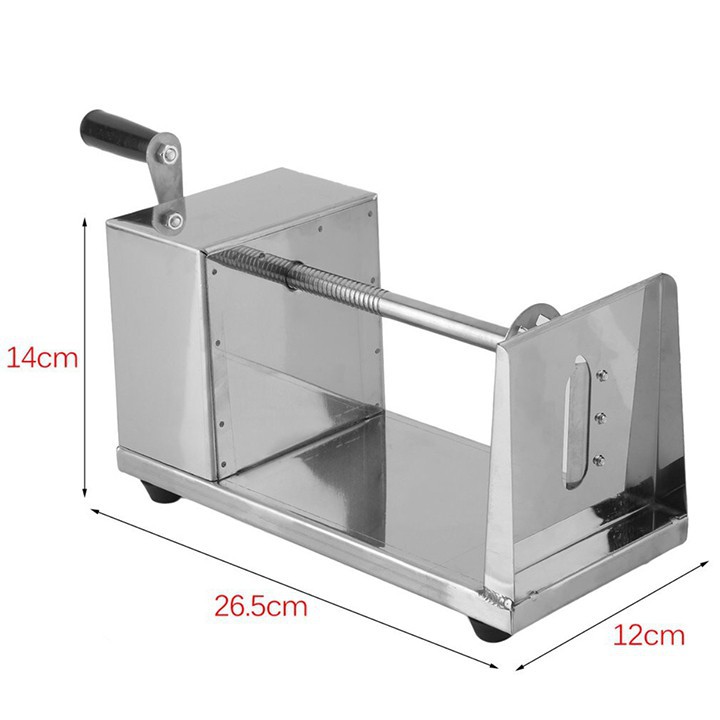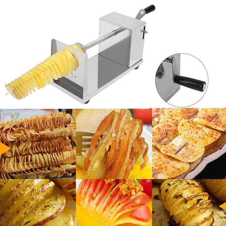 - Máy khoai tây lốc xoáy còn được gọi là máy cắt khoai tây xoắn vòng. Tháo lắp dễ dàng, kích thước nhỏ nhẹ, dễ vận chuyển và sử dụng