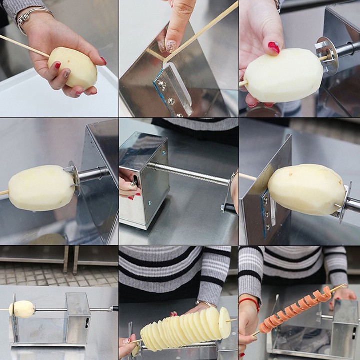 - Máy khoai tây lốc xoáy còn được gọi là máy cắt khoai tây xoắn vòng. Tháo lắp dễ dàng, kích thước nhỏ nhẹ, dễ vận chuyển và sử dụng