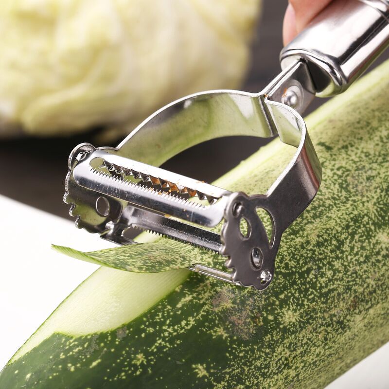 - Dụng cụ bào sợi, bào rau củ đa năng là sản phẩm được làm từ inox không gỉ có độ bền tương đối cao, ít bị hư hỏng và axit ăn mòn trong quá trình sử dụng. Nó được tích hợp từ 2 lưỡi dao đa năng vừa có thể gọt rau cụ và vừa có thể bào sợi giúp cho món ăn trở nên hấp dẫn hơn. Chính vì vậy nên các loại dụng cụ bào sợi, bào rau củ này còn được gọi là nạo hoa quả, dao bào đa năng…