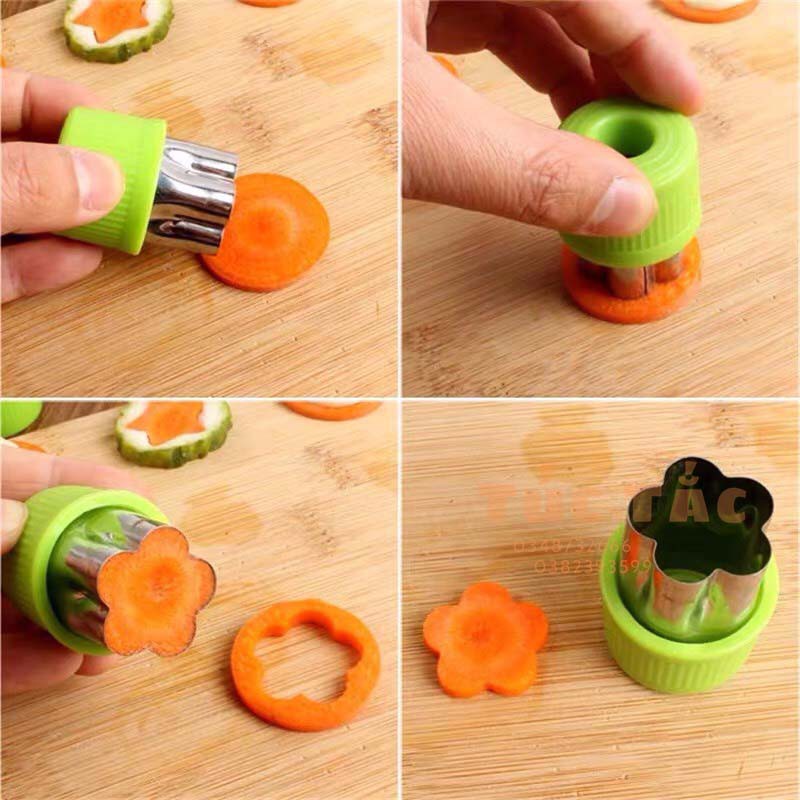 Việc bạn cần làm đơn giản chỉ là ấn khuôn vào lát hoa quả có sẵn ( dày, mỏng tùy món), lấy ra thì có ngay các loại hoa đẹp mắt
