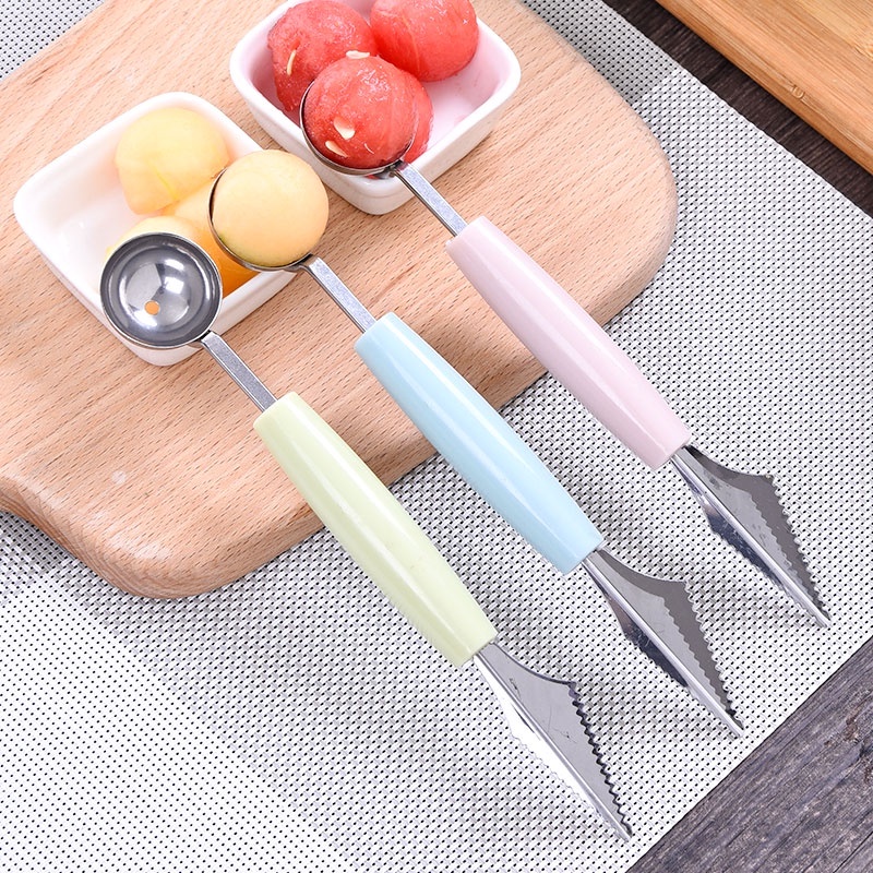 Muỗng hai đầu được thiết kế gồm 2 đầu, một đầu dùng để múc các loại quả mềm như dưa hấu, đu đủ, thanh long… một đầu để tỉa rau củ, hoa quả, cho bạn gái thể hiện sự khéo léo và cắt tỉa nhiều dĩa hoa quả bắt mắt cho cả gia đình.