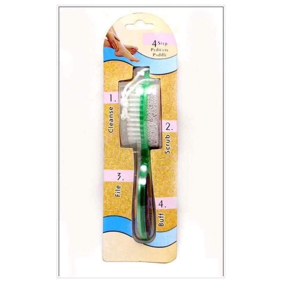 Dụng cụ chà gót chân được thiết kế tiện dụng với 4 mặt gồm bàn chải nhựa, đá bọt khô, bàn chải kim loại, bàn chà nhám.