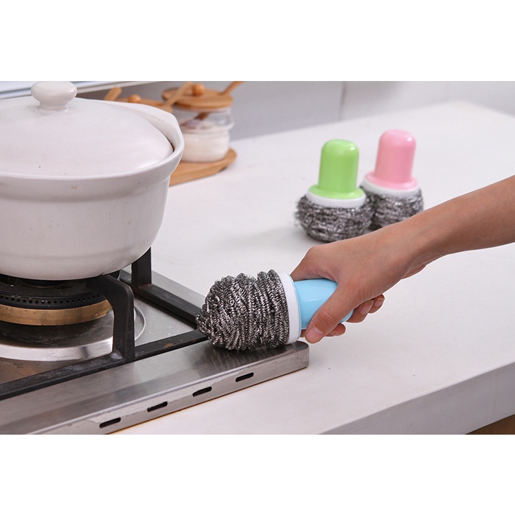 Cọ rửa xoong chén có tay cầm được thiết kế đầu cọ là những sợi inox, không gỉ, có tay cầm hạn chế xước, đứt tay khi sử dụng. Phần cọ sắt dễ tháo lắp, thay thế.