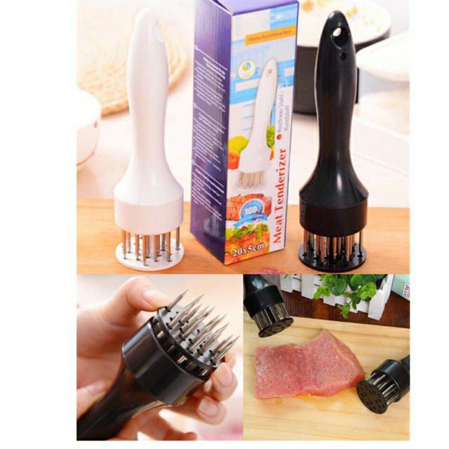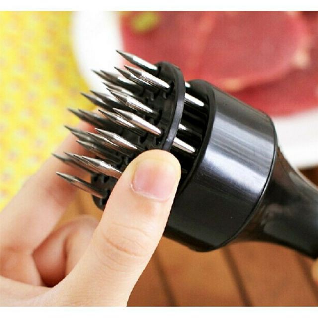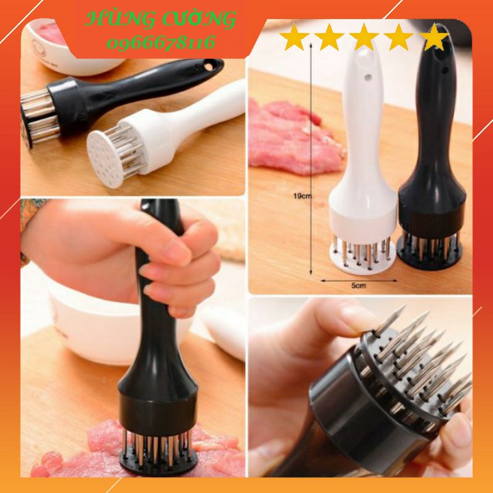 - Kiểu dáng nhỏ gọn, vừa vặn tay cầm, làm bằng chất liệu nhựa, inox bền và an toàn cho sức khỏe, giúp làm mềm thịt, bít tết trước khi ướp gia vị; xăm bì lợn trước khi rán,...