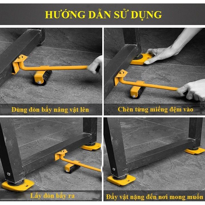 Đặt 4 bánh xe vào 4 góc vừa nâng sau đó là có thể nhẹ nhàng đẩy đồ vật đến chỗ cần di chuyển.