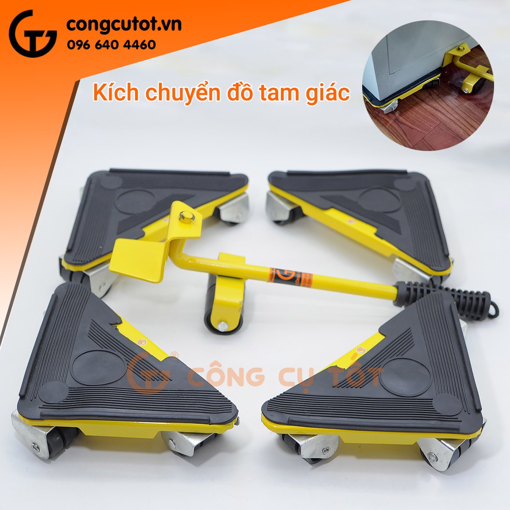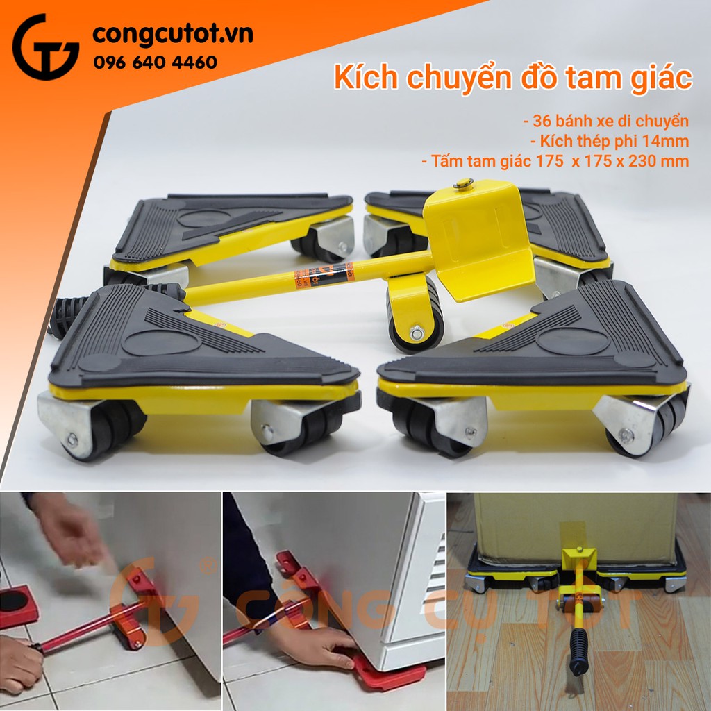 Kích chuyển đồ tam giác là dụng cụ để di chuyển các đồ đạc nặng với 1 người bao gồm một kích bẩy bằng sắt phi 14 và 4 tấm lót sắt hình tam giác vuông cân cạnh huyền 23 cm, có các lót cao su chống trượt. Chỉ cần một người bẩy kích lên, luồn các tấm lót vào các góc là bạn dễ dàng di chuyển tủ, két sắt.Không cần phải khiêng đồ nặng nữa !