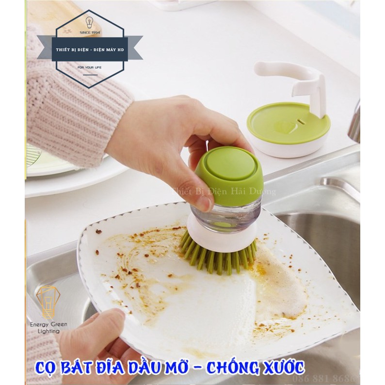 - Sản phẩm tiện lợi có bình đựng nước rửa bên trên đầu cọ giúp bạn thuận tiện lợi hơn trong công việc vệ sinh dụng cụ nhà bếp.