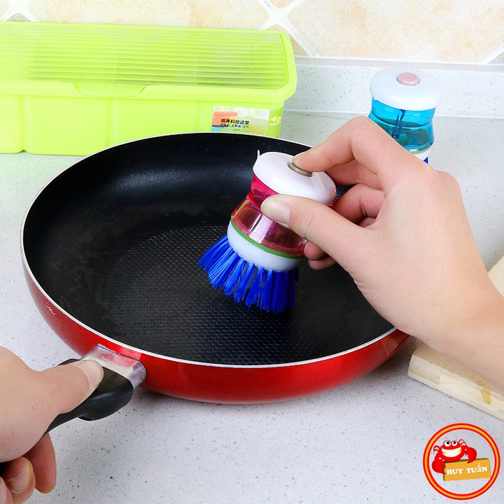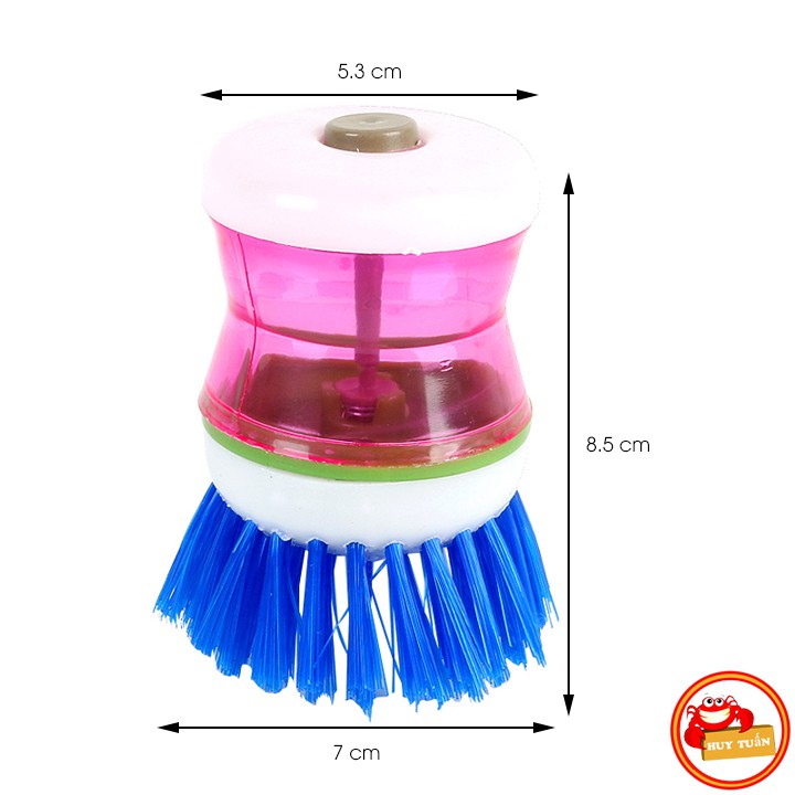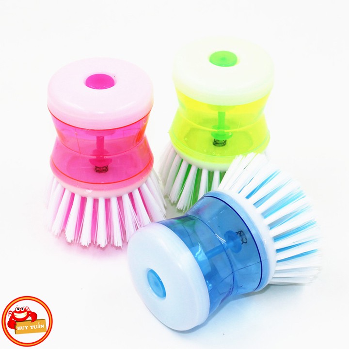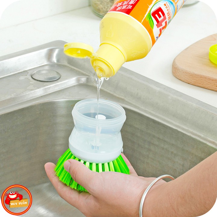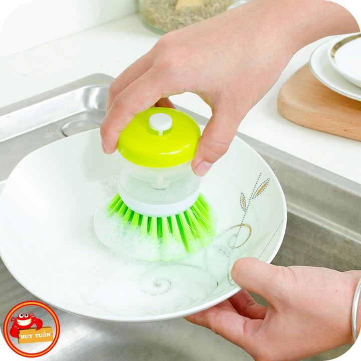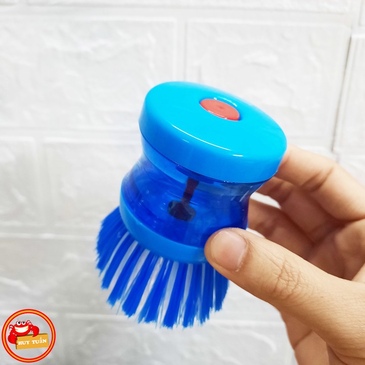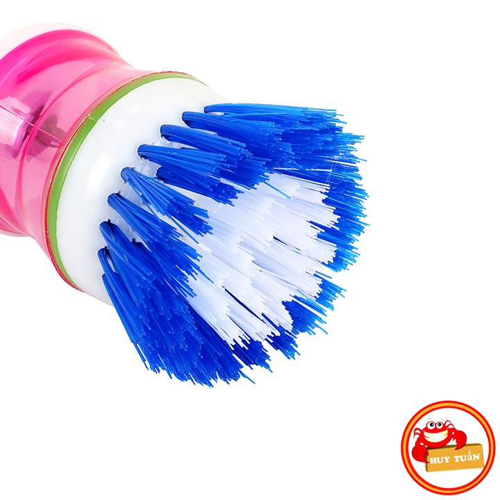 – Sản phẩm có một bầu đựng xà phòng rửa chén bát ở phía trên. Khi bạn cọ xoong nồi, nước rửa chén sẽ tự động chảy xuống phần bàn chải giúp tẩy cọ thật nhanh và sạch, ấn nhẹ vào nút này mỗi khi muốn có thêm xà phòng khi cọ rửa