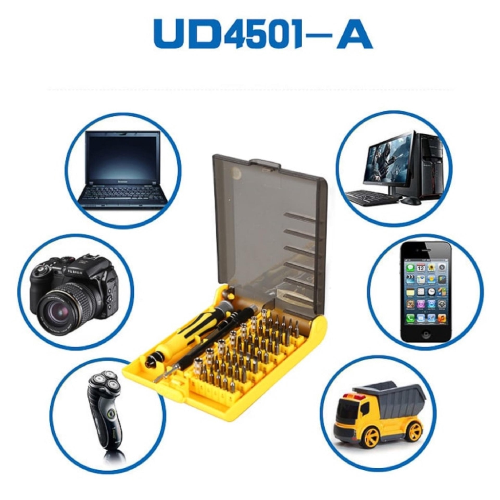 BỘ DỤNG CỤ ĐA NĂNG TUA VÍT 45 TRONG 1 SỬA CHỮA IPHONE, MÁY MÓC, DỤNG CỤ GIA ĐÌNH, ĐIỆN THOẠIBộ tua vít 45 đầu: đầy đủ các dạng đầu như dẹt, 2 lỗ, tam giác, lục giác, các loại đầu từ 3 đến 6 cạnh. Mỗi dạng đầu gồm nhiều kích thước khác nhau, đảm bảo mở được tất cả các linh kiện. Sản phẩm thích hợp cho các chuyên viên kỹ thuật, những sinh viên chuyên ngành điện, điện tử hay những người thích khám phá và tìm hiểu các thiết bị điện và điện tử.