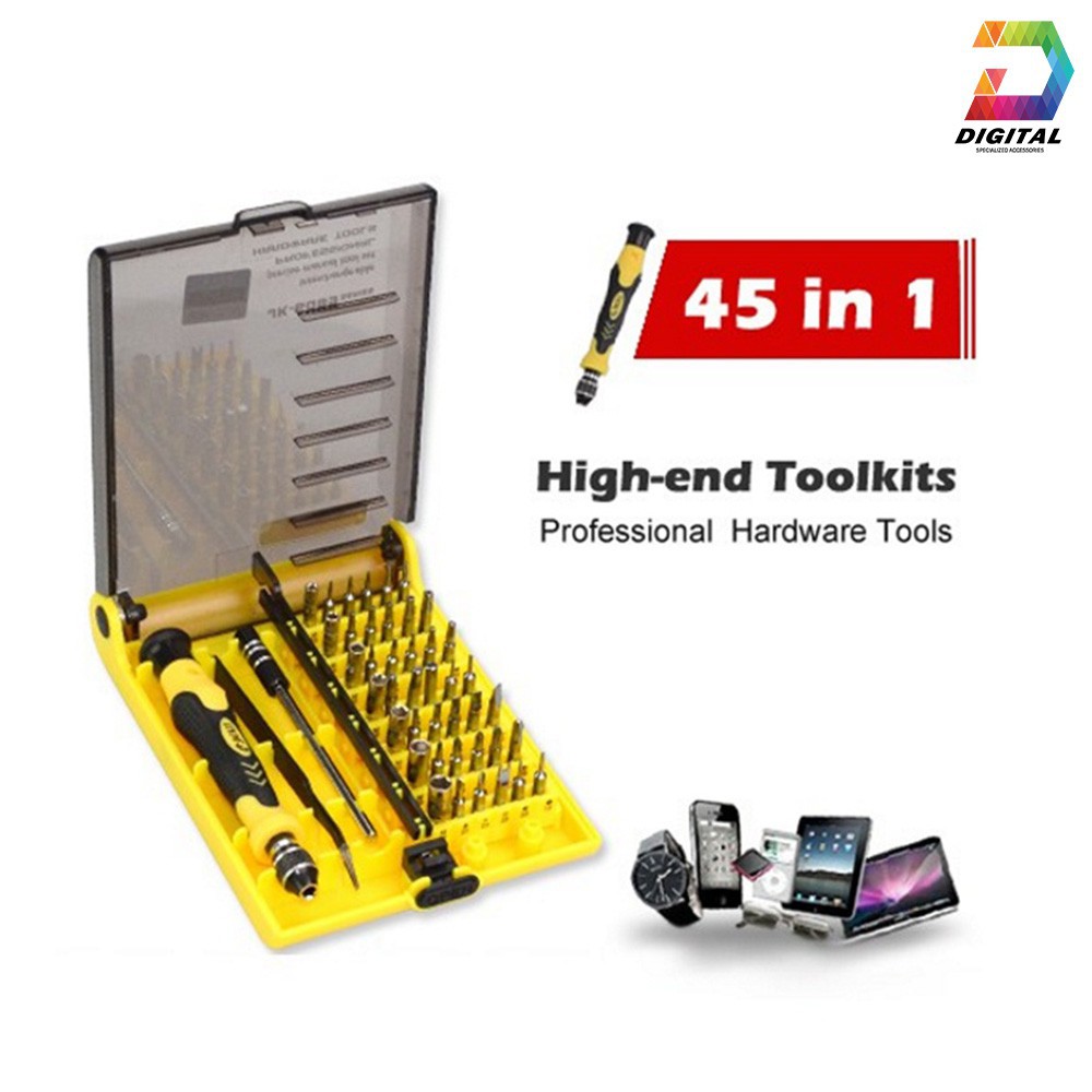 Bộ dụng cụ đa năng tua vít 45 trong 1 sửa chữa Iphone, máy móc, dụng cụ gia đình, điện thoại- Các đầu vít được làm bằng thép chất lượng cao nên không gây hư hại cho các linh kiện. 45 đầu vít được xếp trong hộp rất tiện dụng và khoa học. Chỉ cần một thao tác đơn giản, bạn sẽ chọn được ngay đầu vít cần sử dụng.