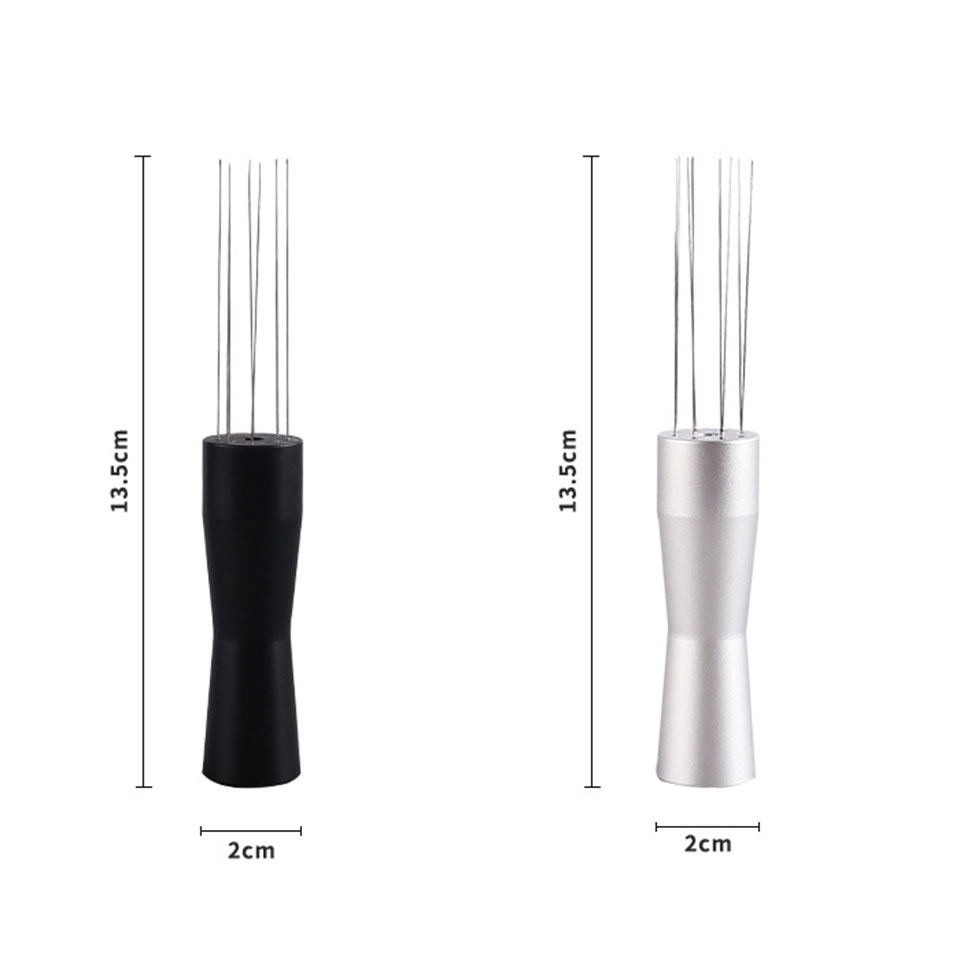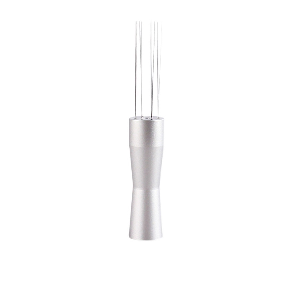 Dụng cụ đánh tơi bột cà phê Espresso với thân cầm được làm bằng hợp kim nhôm và được thiết kế công thái học mang lại cảm giác cầm nắm và sử dụng tốt. Thân được làm phẳng ở phần đuôi nên bạn có thể dựng dụng cụ lên để thẳng đứng khi không sử dụng. Được gắn liền với thân là 8 thanh kim thép không gỉ với đường kính nhỏ chỉ 0.4mm giúp dễ dàng đánh tơi và hạn chế vón cục trong bánh cà phê.