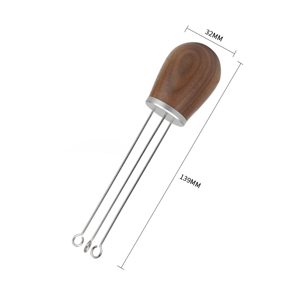Dụng cụ đánh tơi bột cà phê Espresso được thiết kế với núm cầm bằng gỗ cao cấp, cảm giác cầm rất chắc chắn và vừa tay, 3 thanh thép được uốn hình tròn ở phần đầu làm tăng diện tích tiếp xúc, len lỏi đánh tơi đến mọi nơi bên trong bánh cà phê. Khi đánh tơi được bột cà phê sẽ giúp cho phần Tamping tốt hơn rất nhiều, nước qua áp suất sẽ chiết xuất đều hơn, tránh tình trạng channeling thường gặp nếu bạn không phải một người pha chuyên nghiệp.
