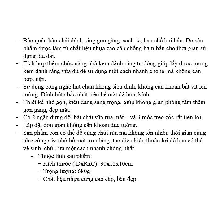 - Có 2 ngăn đựng đồ, bài chải sữa rửa mặt ...và 3 móc treo cốc rất tiện lợi.