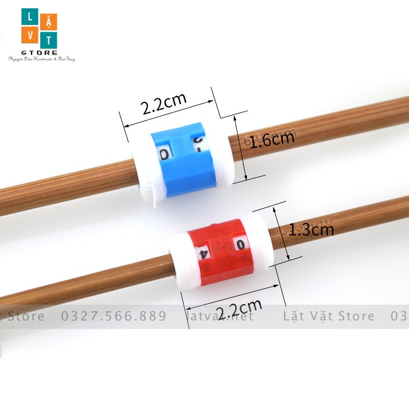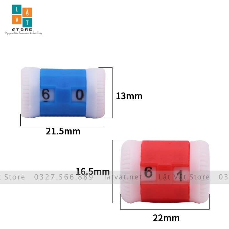 -----Tên: Bộ đếm 2 cái Chất liệu: Nhựa Trọng lượng: Khoảng 3 gam Màu sắc: Đỏ, Xanh Mục đích: Dùng để ghi số hàng đan trong quá trình đan