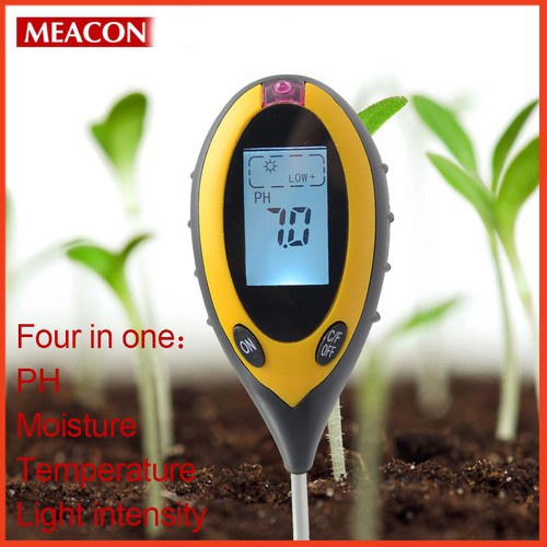 Máy đo độ PH đất 4 trong 1(PH, độ ẩm, ánh sáng, nhiệt độ) hay gọi là Dụng cụ đo PH 4 trong 1 đồng hồ hiển thị dạng điện tử, đo độ ẩm của đất, đo quang thông ánh sáng, đo nhiệt độ. (4 trong 1)Phần đo độ PH giá trị tương ứng là 3.5-9 trên đồng hồ hiển thị số, giá trị cơ bản của 7 là trung tính, nhỏ hơn số lượng lớn hơn các axit, theo cây trồng cần điều chỉnh độ pH của đất cho phù hợp.