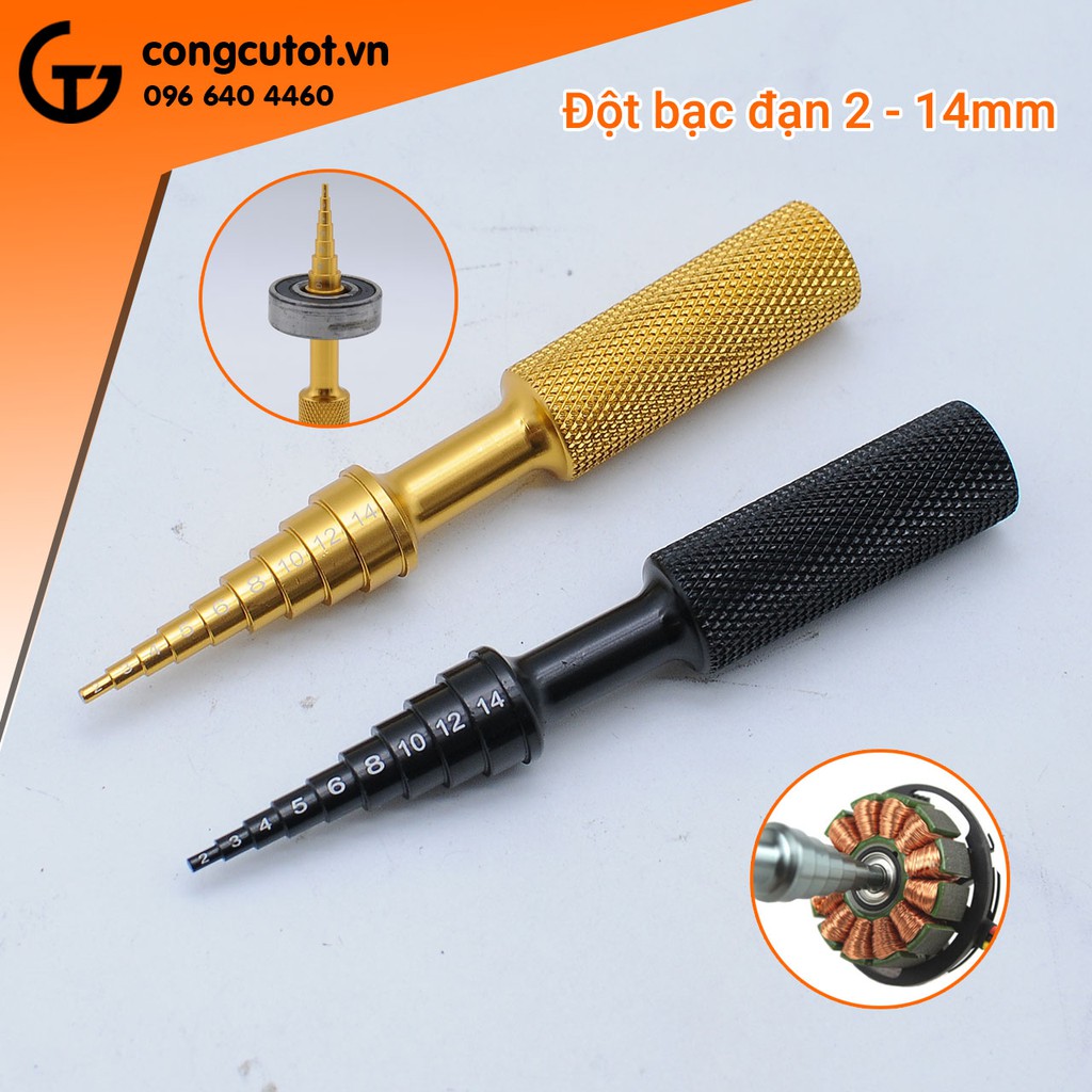 Đột vòng bi hay còn gọi là đột bạc đạn là dụng cụ dùng để tháo lắp vòng bi bạc đạn một cách dễ dàng với nhiều cỡ đường kính khác nhau rất tiện lợi. Đột bạc đạn có 9 bước đường kính từ 2 đến 14 mm để xử lý nhiều đường kính trong của bạc đạn khác nhau. Được làm bằng hợp kim nhôm khá nhẹ, có khắc số đường kính ở mỗi vòng.Thông thường, để tháo vòng bi bạc đạn ta dùng một cây đột tròn nhỏ để gõ ra. Với mỗi một đường kính vòng bi ta lại phải dùng một đường kính đột. Với cây đột bước, ta có thể đột nhiều vòng bi khác nhau