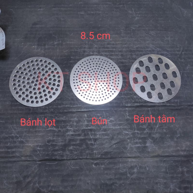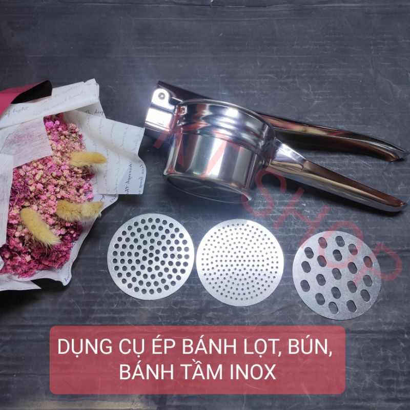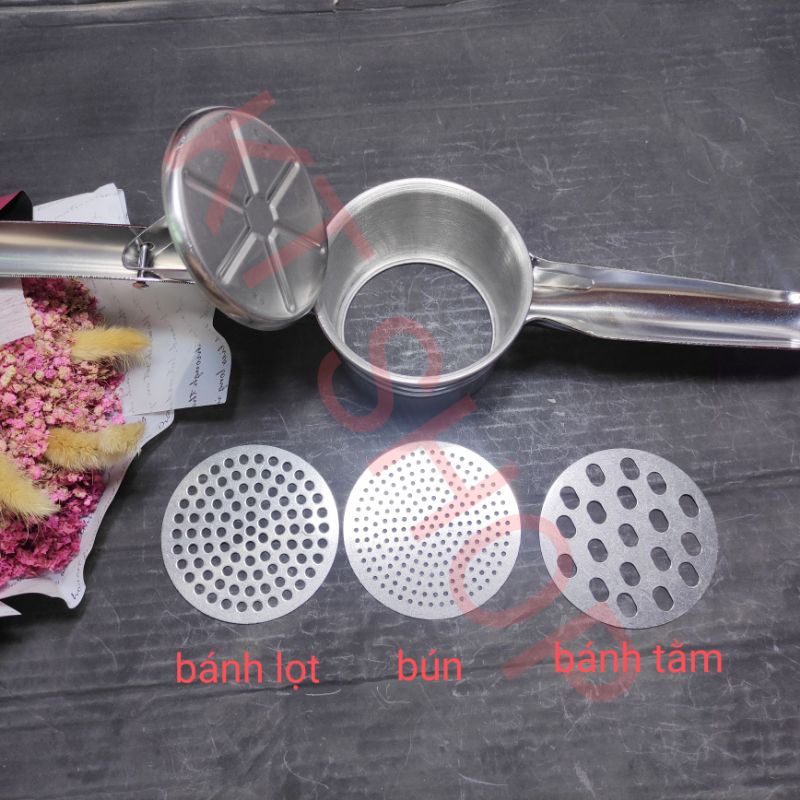 Chất liệu thép không gỉBộ sản phẩm gồm 3 mặt với 3 chức năng khác nhau. Mặt lỗ to nhất dùng để ép bánh tằm. Mặt lỗ trung dùng để ép bánh lọt và mặt lỗ nhỏ nhất để ép bún.