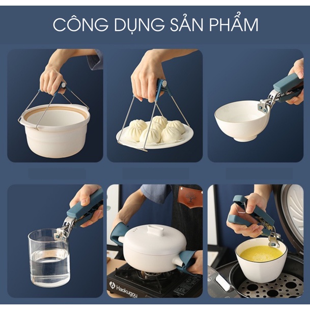 - Kẹp gắp được thiết kế như 1 chiếc kìm với một đầu kim loại chắc chắn, tay cầm nhựa cách nhiệt, đầu kim loại có tác dụng giữ chặt vật thể, giúp bạn dễ dàng gắp tô, chén nóng mà không sợ bị bỏng