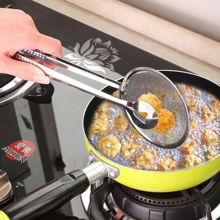 Thiết kế đặc biệt, tiện lợi với 1 bên là đầu kẹp, 1 bên là mặt lưới, giúp bạn có thể gắp trực tiếp thức ăn đang chiên, luộc, hầm… thực phẩm sẽ được ráo nước cũng như hạn chế tối đa việc đọng lại dầu mỡ.