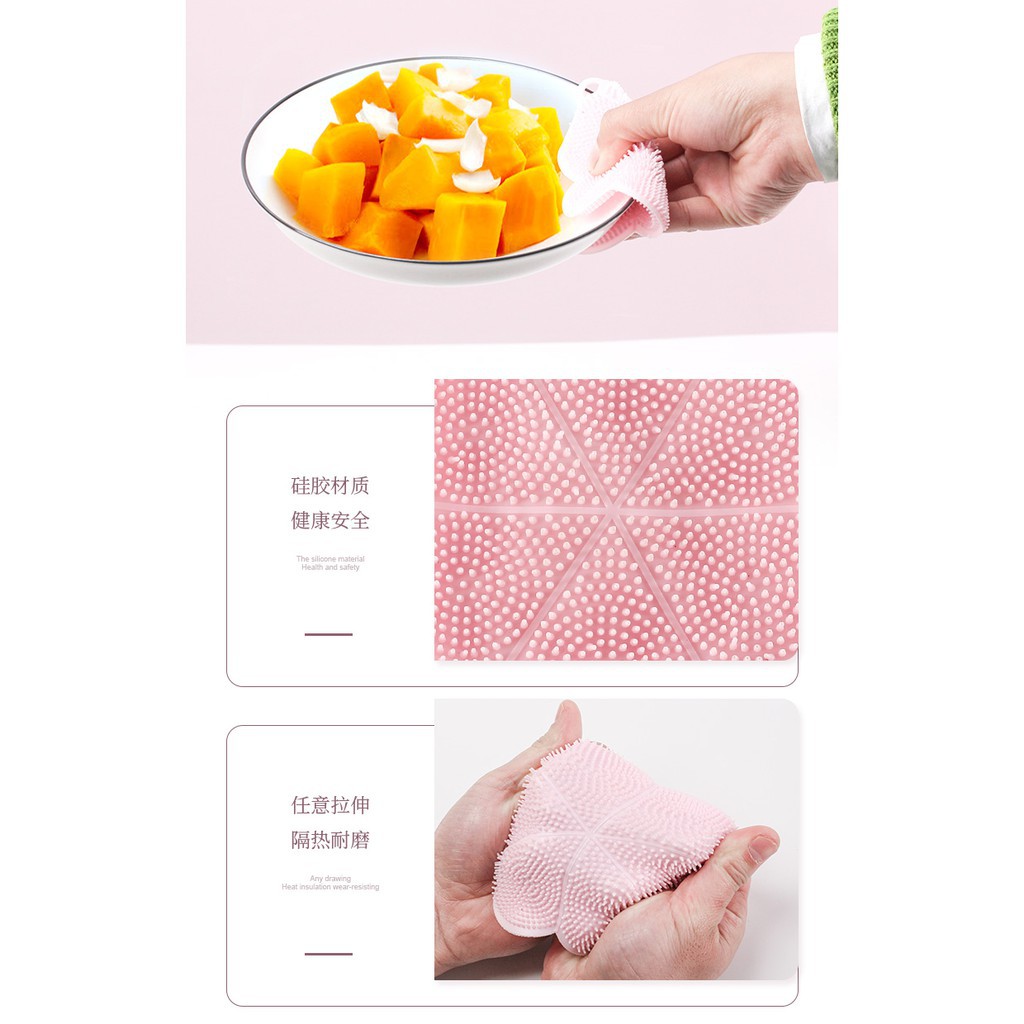 – Cuối cùng là 2 miếng rửa bát bằng silicone có gai, đánh bay các vết bẩn, bám cặn trên xoong nồi mà không ảnh hưởng tới bề mặt vật dụng.