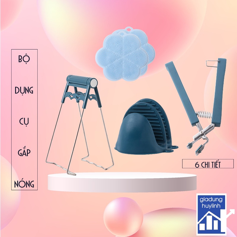 Bộ dụng cụ gắp đồ nóng, kẹp bát đĩa, găng tay bắc nồi mỏ vịt, miếng rửa bát silicon 6 chi tiết (BGN06)
