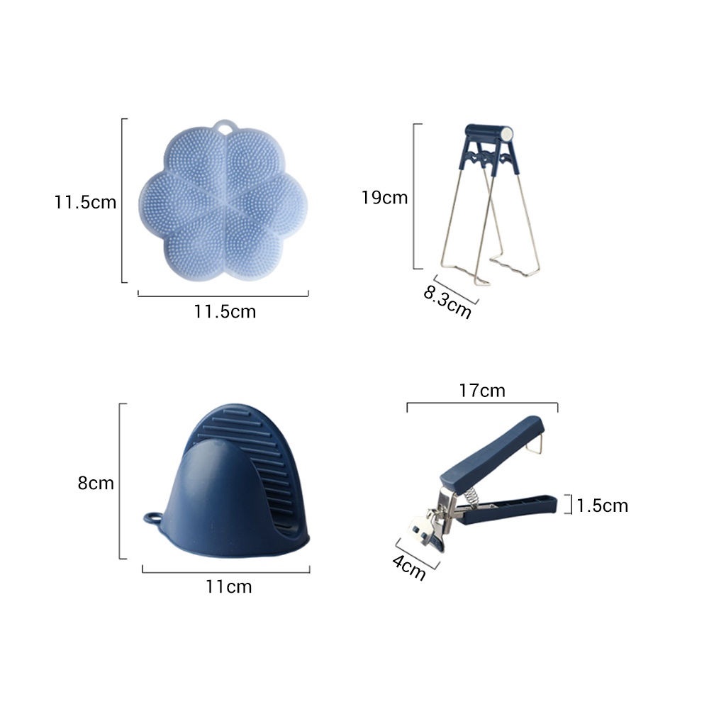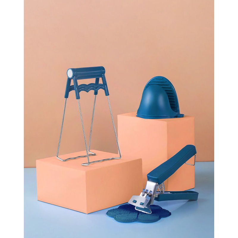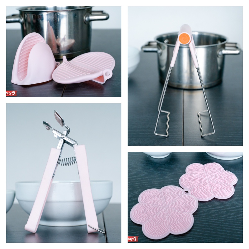 Một set bao gồm đầy đủ: 1 kẹp gắp đồ,1 giá bung kẹp đĩa, 2 găng tay silicon, 2 lót nồi.