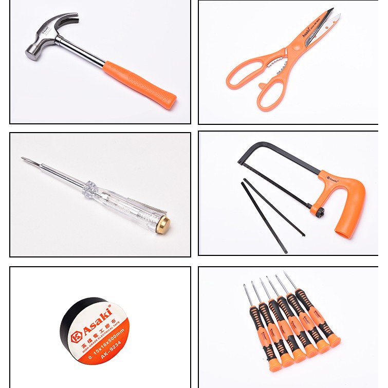 - Bộ dụng cụ gia đình Asaki gồm nhiều chi tiết hữu ích giúp bạn thực hiện các công việc đơn giản như lắp đặt, vệ sinh các thiết bị điện trong gia đình cho đến các công việc đòi hỏi chuyên môn cao như tháo lắp, sửa chữa các thiết bị điện, điện tử viễn thông... Các chi tiết được đựng trong hộp nhựa với các khe riêng biệt, chắc chắn, an toàn, hạn chế va đập hay lộn xộn trong khi di chuyển, cất giữ.