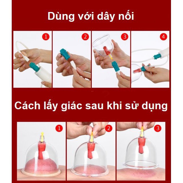 - Bằng phương pháp hút chân không, sản phẩm dùng ống hút để các ống giác hơi hút vào cơ thể tại các huyệt để tạo ra kích thích tuần hoàn máu, loại bỏ các bệnh như trúng gió, cảm lạnh, ẩm ướt, nóng và nhiễm độc… và từ đó lưu thông khí huyết.