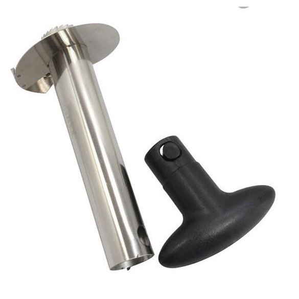 - Thiết kế của dụng cụ gọt thơm (còn gọi là khóm) với lưỡi xoay vòng quanh lõi, chỉ với vài vòng là có thể lấy ra một quả dứa ngon tuyệt không còn mắt và cùi.
