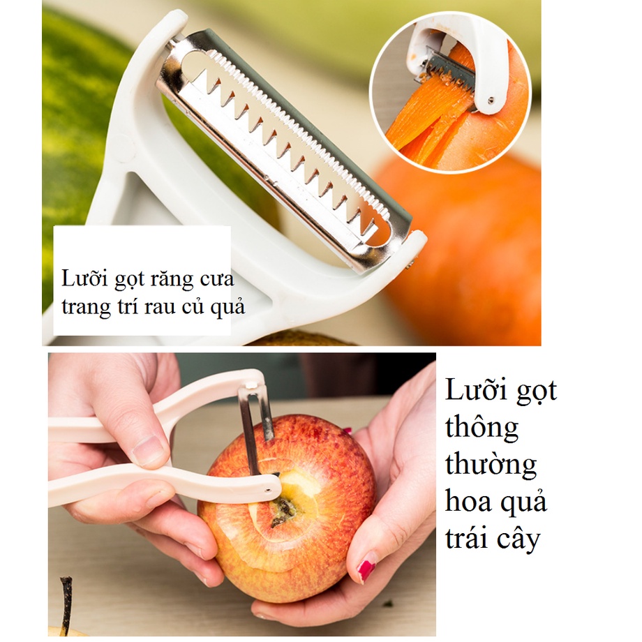 - Sản phẩm có 2 lưỡi : lưỡi để gọt hoa quả thông thường, và 1 lưỡi dùng để nạo gọt và trang trí