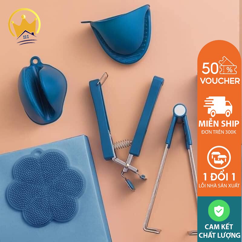 🔸Một set bao gồm đầy đủ: 1 kẹp gắp đồ,1 giá bung kẹp đĩa, 2 găng tay silicon, 2 lót nồi.